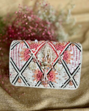 Gold flap over clutch multi hued is decadently hand embroidered with an assortment of gold beads and Pearls . It has an ornate yet elegant look making it a statement accessory. this collectible statement accessory fits in your valuables like a smartphone, makeup, keys, currency and cards.