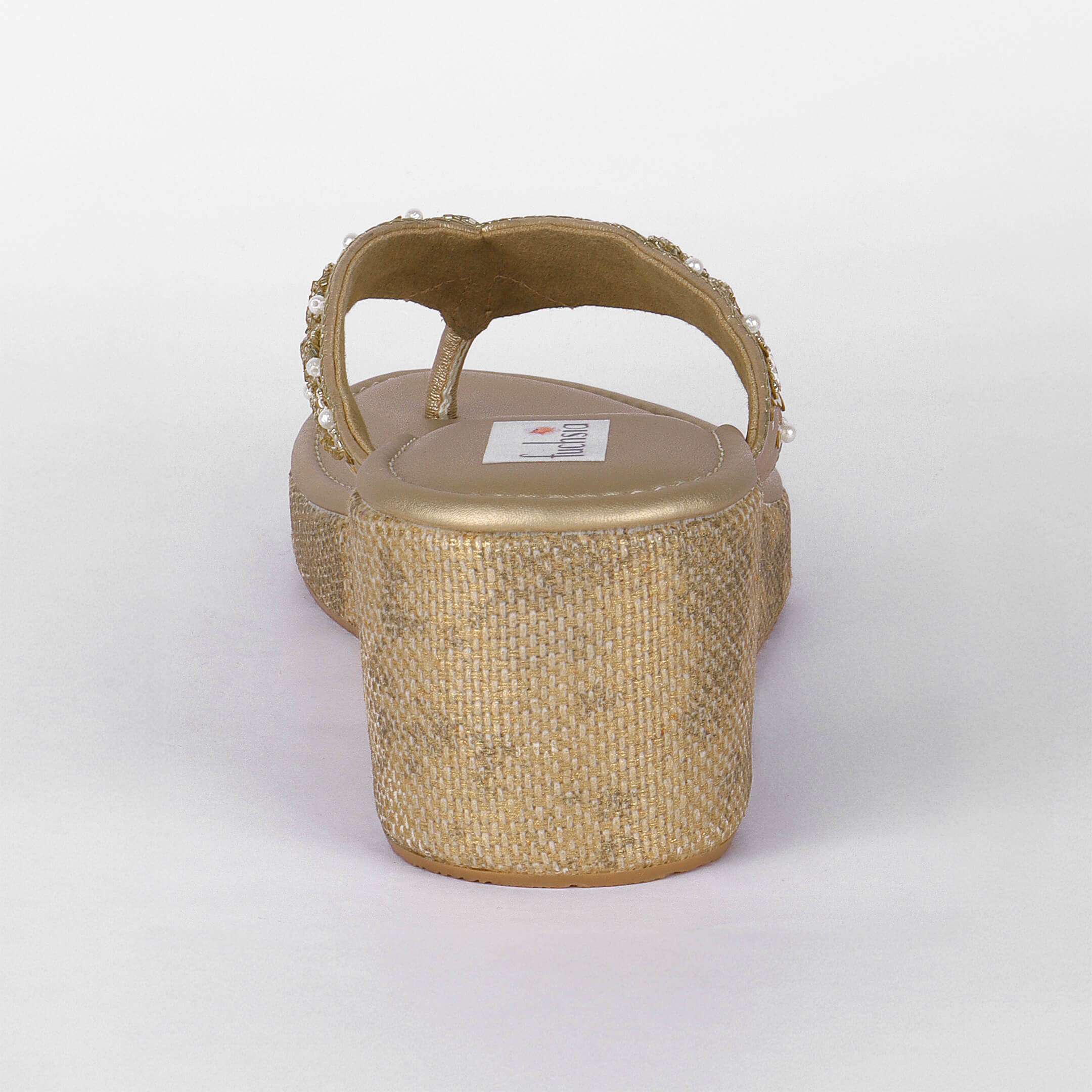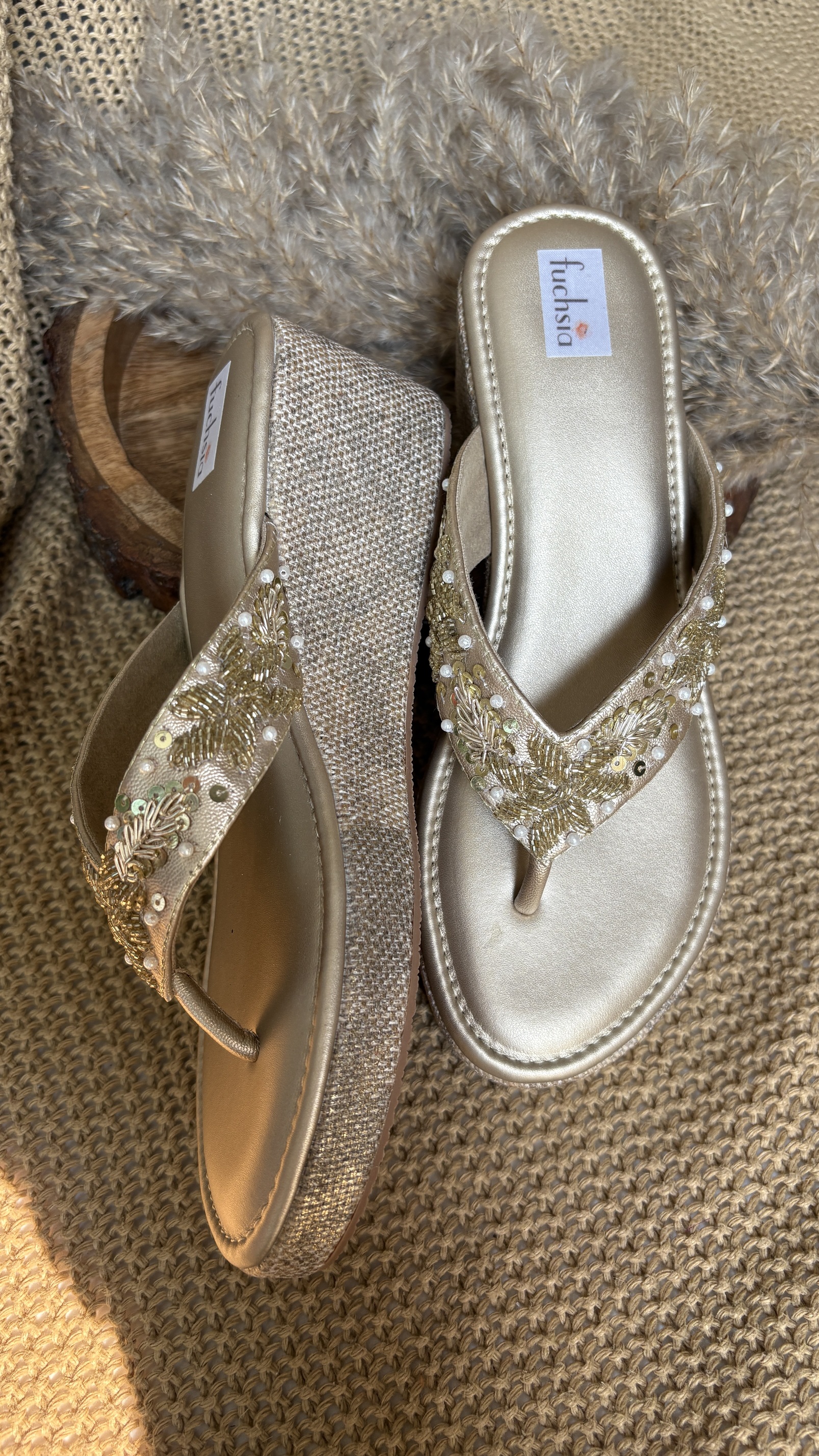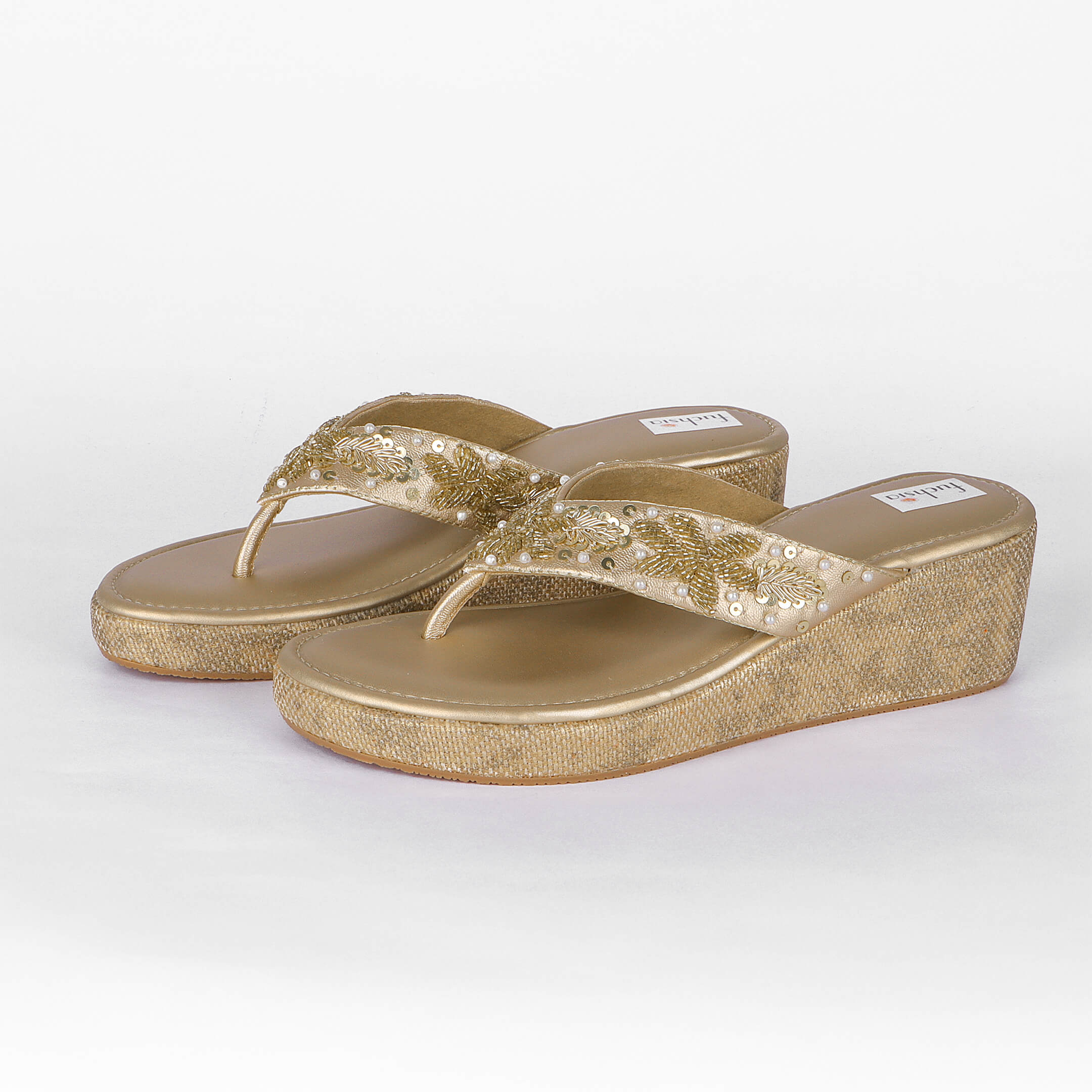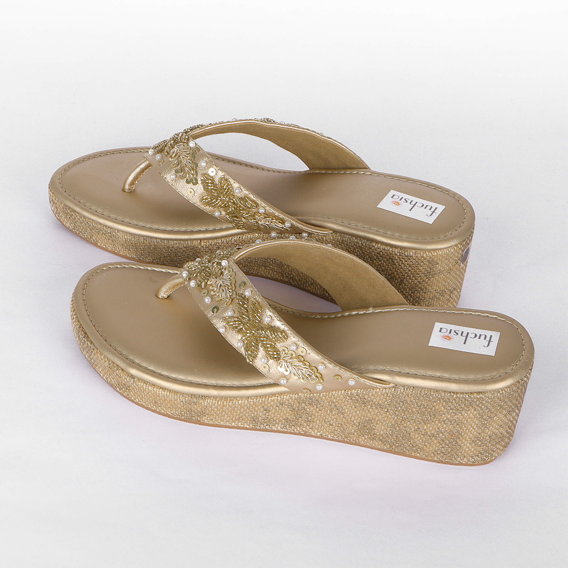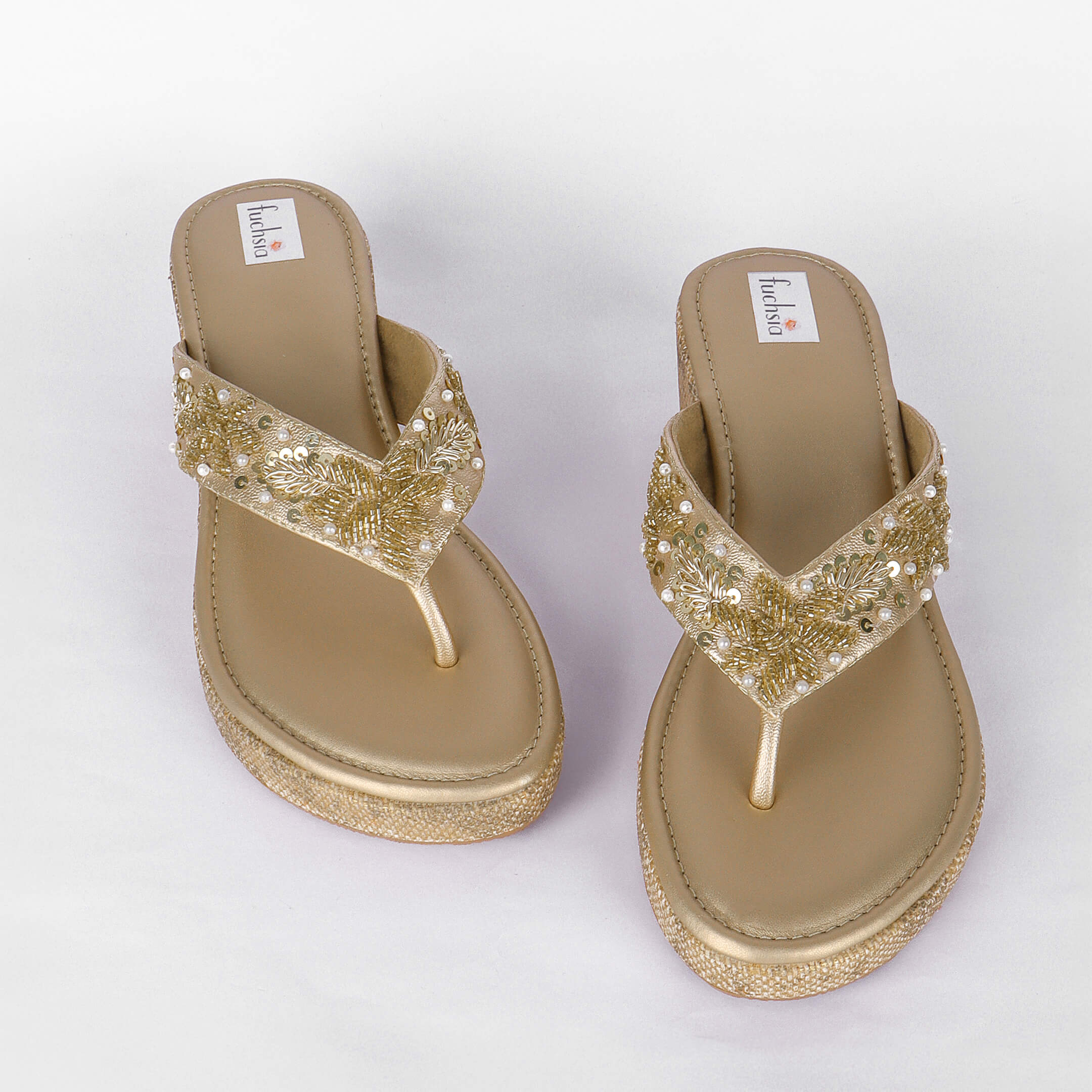 Make your style mesmerising with this gorgeous gold heel that’s accentuated by zardosi worl and a sprinkle of sequins on vegan leather fabric. 2 inch heel height making it a unique and comforable pair to style with indian attires.